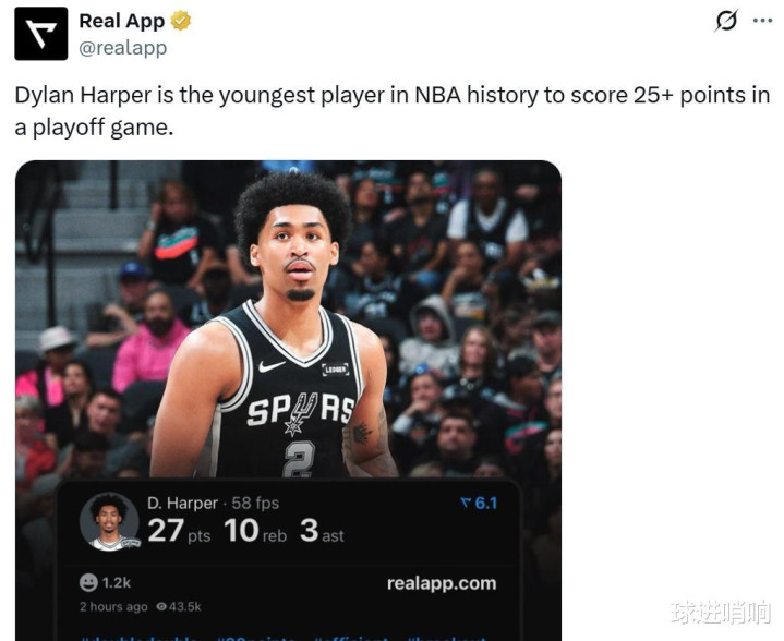 第三节亦然哈珀单节驾御12分指引马刺队承接完成反超,单节拿下12分也让哈珀卓越吉诺比利创造马刺队史少壮单节得分记录。 同期27分不仅创造哈珀单场得分新高,也让其成为NBA历史上拿下25+得分最年青的球员。